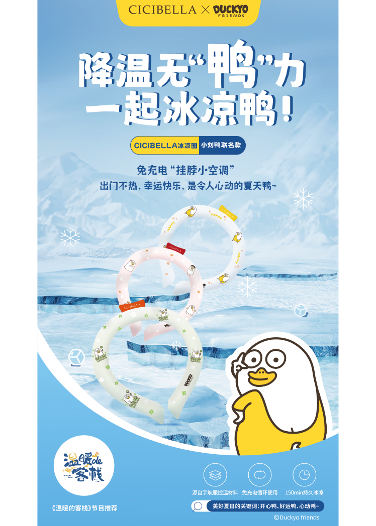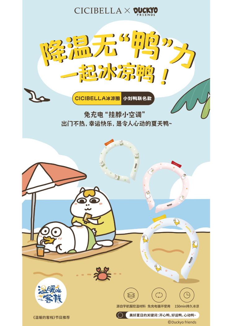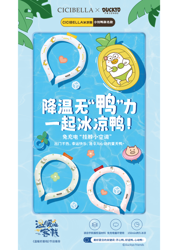 小刘鸭携CICIBELLA冰凉圈,为你带来夏日清凉,同时还是综艺节目《温暖的客栈》推荐的夏日清凉好物!时尚与舒适相结合,冰凉圈为你带来解暑的同时展现个性魅力。无论是户外活动还是室内休闲,小刘鸭冰凉圈都是你的清凉伴侣,让你时刻保持凉爽自在。夏日降温解暑神器,尽在CICIBELLA冰凉圈,与小刘鸭一起开启清凉夏日的新旅程!