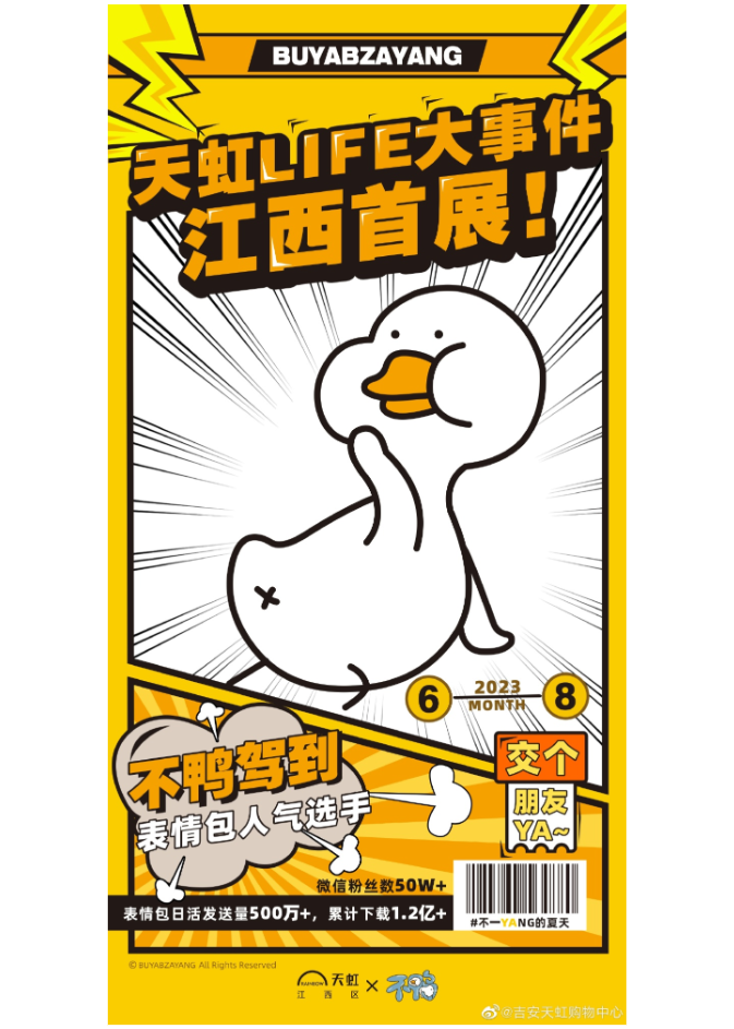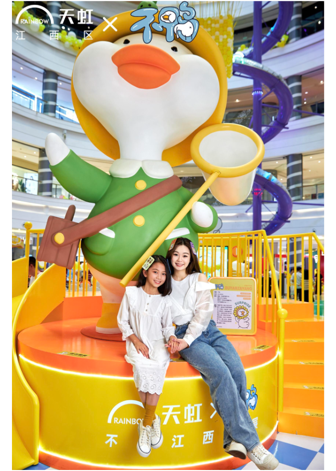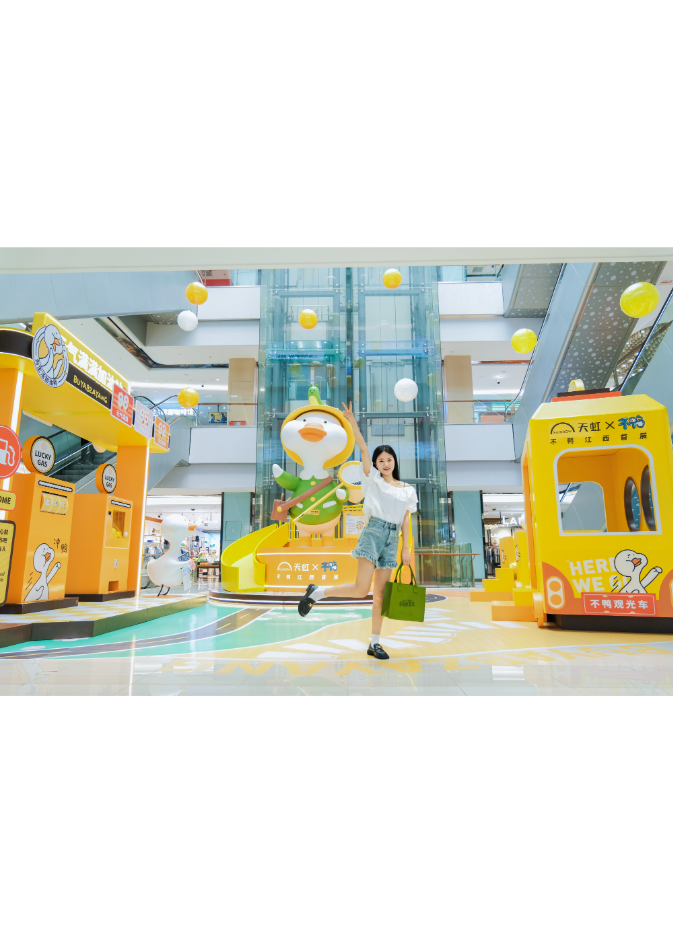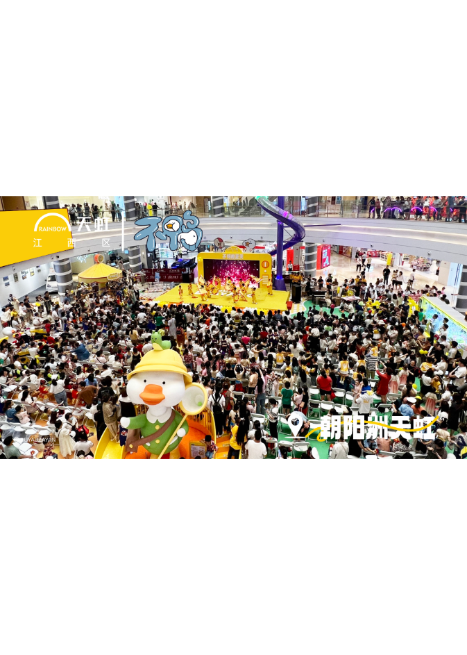 江西天虹商场在暑期档期,联手人气IP不鸭不咋样,在江西全省落地17场。涵盖了主题展陈门店与氛围性物料门店。儿童节当天,朝阳店当日客流突破10w+,落展8家店 整体客流总计45w+。全区域的同比销售额提升20%,渠道推广曝光数据200w+。现场亲子客群众多,拍照打卡,私域流量传播广。