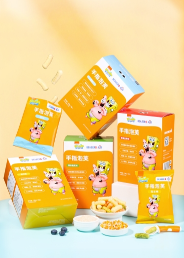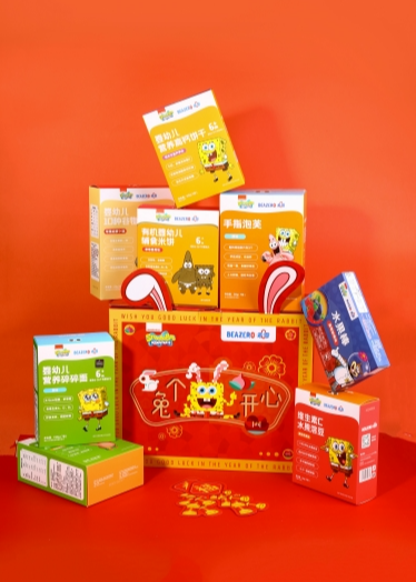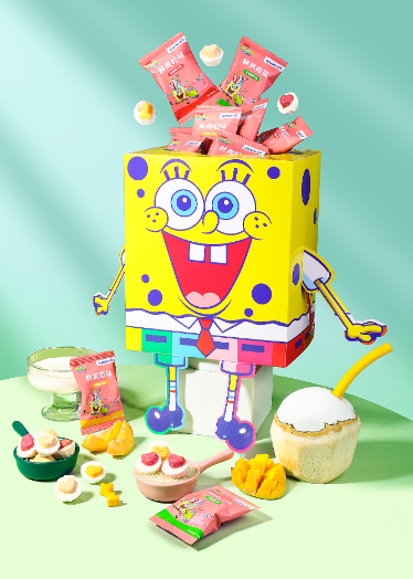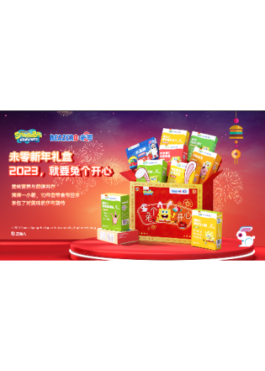 自2017年合作以来,未零品牌一直在致力于推海绵宝宝系列产品,主要聚焦在婴幼儿零食线,将其作为核心产品经营。目前海绵宝宝儿童辅食系列的销量及销售额均为婴童食品各渠道类目中的TOP5,走进了千万家庭,备受市场认可。为了推广该系列产品,未零将营销策略划分为线上及线下两大板块运营。在线上,未零投放的广告覆盖了天猫、京东、抖音、小红书等中国超一线社交媒体及电商平台,年曝光量超1亿次,触达人群累计1千万人;在线下,未零合作的超市及店铺超1万家,遍布全国。以2022年上线的海绵宝宝鲜果粒挞单品来举例,未零成功将其打造成为了超级爆品,在多个销售平台都取得了销量TOP 1的新品佳绩。