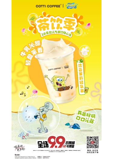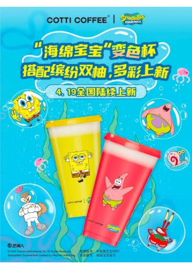 库迪咖啡与海绵宝宝跨界合作,推出4款主题冰杯和热杯、纸袋,以及变色杯、贴纸、亚克力牌等联名周边,传递快乐。