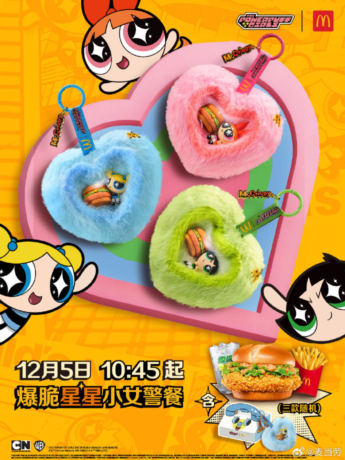 麦当劳 × 飞天小女警联名推出了麦当劳爆脆星星堡、爆脆系列小食甜品等新品四件套,并策划了新品品鉴会,邀请粉丝发布前到店品尝点评,还设计了飞天小女警星星眼镜、飞天小女警星星毛绒包包等可爱周边以及各种IP主题包装。