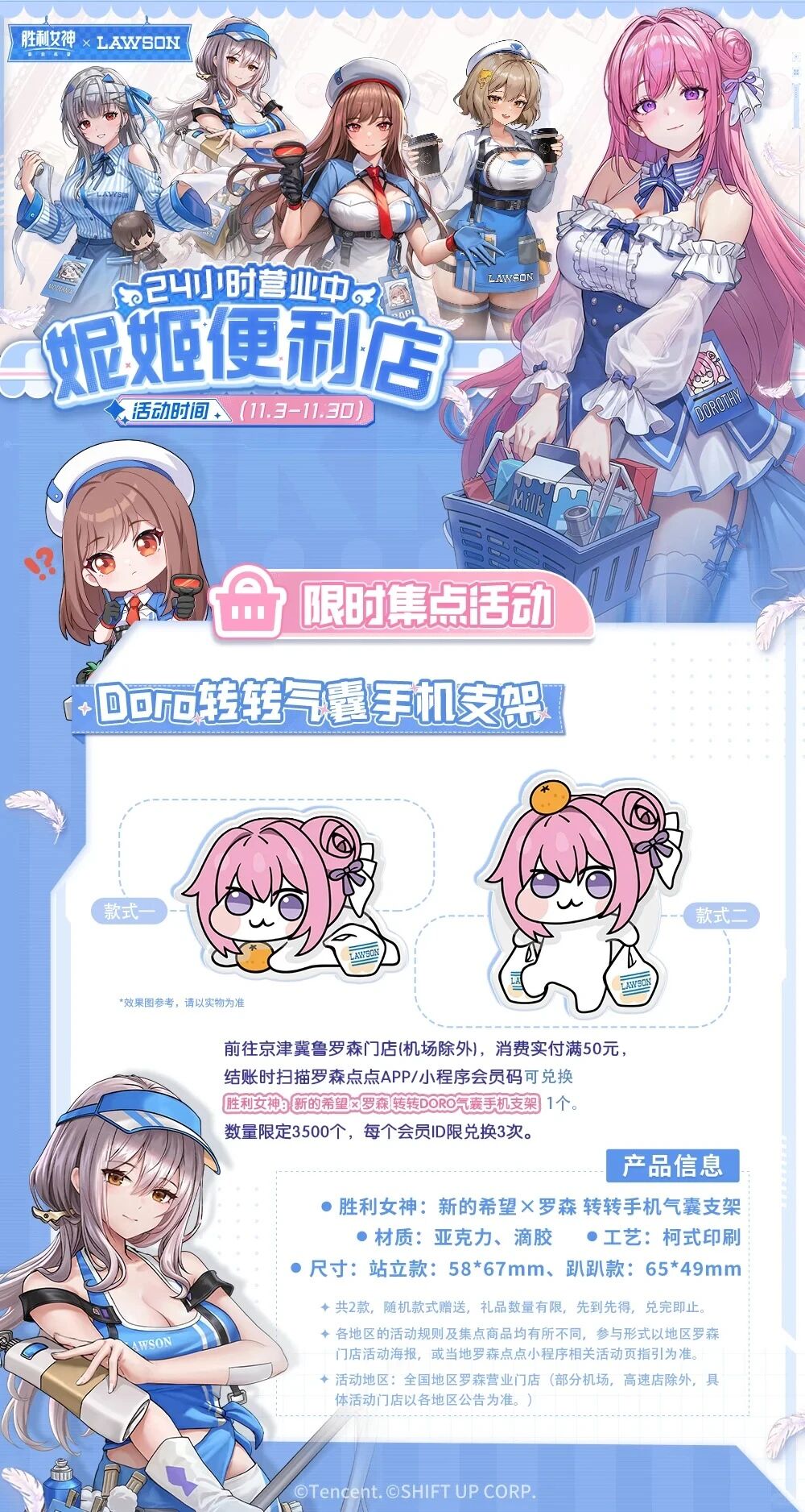 胜利女神:新的希望×罗森联动11月3日已经开启,指挥官们快来集合!11月3日-11月30日,前往相应的罗森门店,即有机会获取【胜利女神:新的希望×罗森 联动Doro转转气囊手机支架】1个。另外线下门店还有联动周边开售!