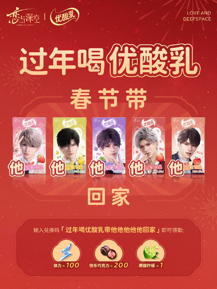 液态奶品牌优酸乳与乙女游戏《恋与深空》推出“恋与深空果然心动之约”主题联名,打造定制风味产品和限定周边,将角色与产品口味绑定精准切入女性消费市场。联动以沈星回、黎深、祁煜、秦彻、夏以昼五位游戏角色为灵感分别打造草莓、冰糖雪梨、葡萄、石榴、苹果专属果味乳饮,形成“果味男友”差异化记忆点。合作还在上海举办线下快闪,依托高黏性的粉丝让产品成为出圈爆款,微博相关话题阅读量超 1.3 亿次,高效触达年轻女性客群,实现品牌与二次元 IP 的双向破圈。