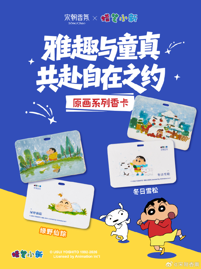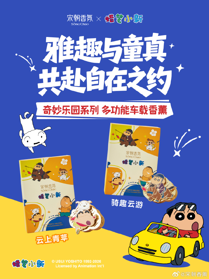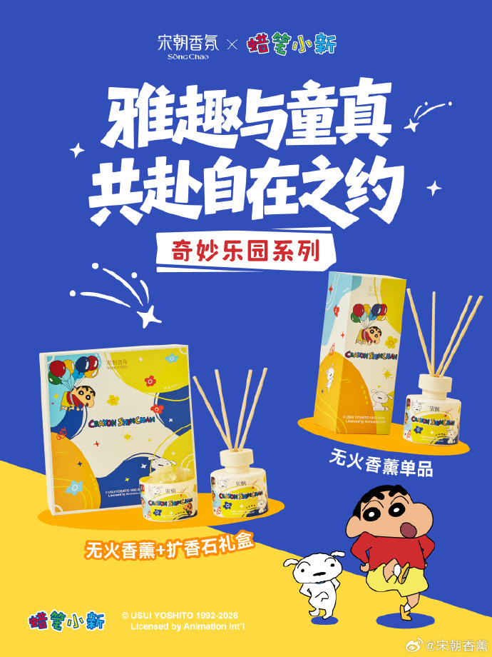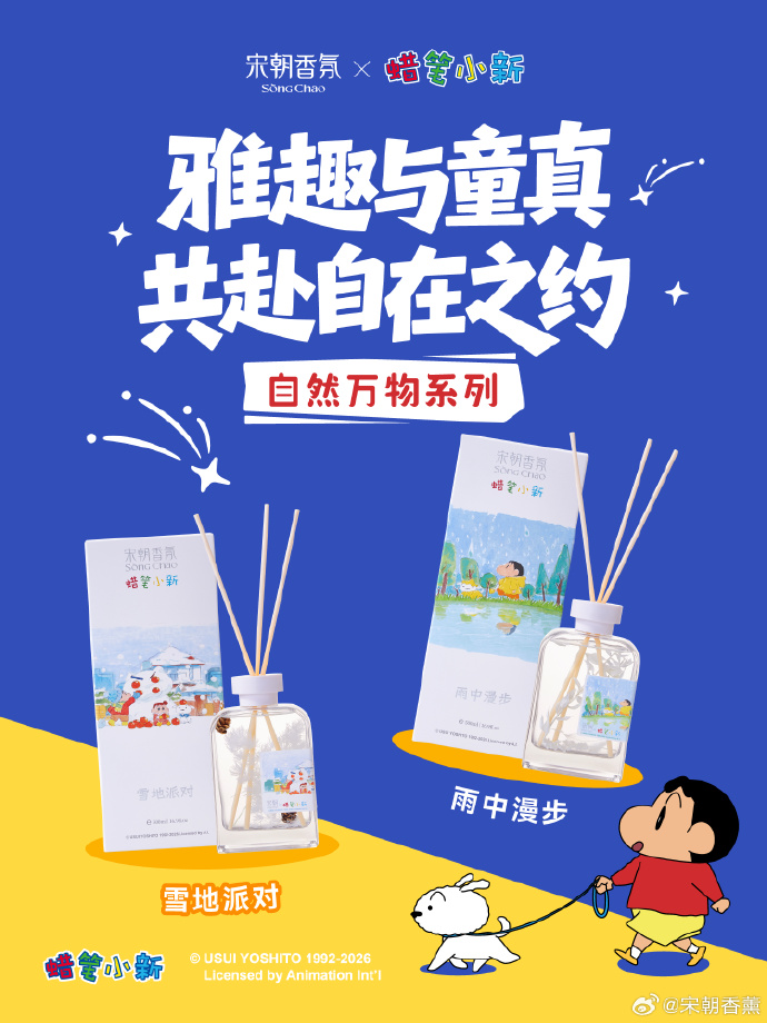 3月14日,蜡笔小新×宋朝香氛推出联名系列,从无火香薰、车载香薰到香卡,小新萌趣形象贯穿全线!不管是自用的单品还是送给朋友的礼盒,不管是居家、通勤还是出行,都能找到适配产品。宋朝香氛一直以来主打的是国风,之前联名也选择徐悲鸿美术馆这种风格一致的合作伙伴,没想到这次牵手拥有广大粉丝群体的蜡笔小新,开始走卡哇伊路线,无疑是一次大胆的拓圈尝试。