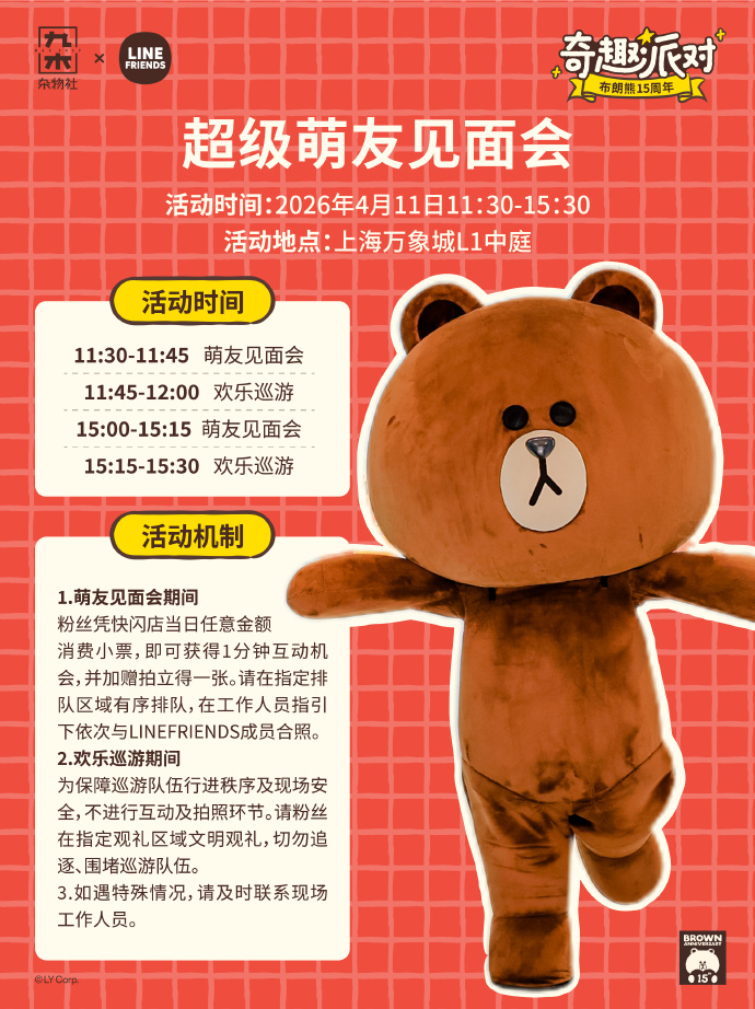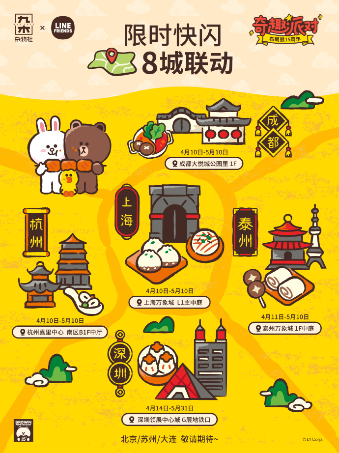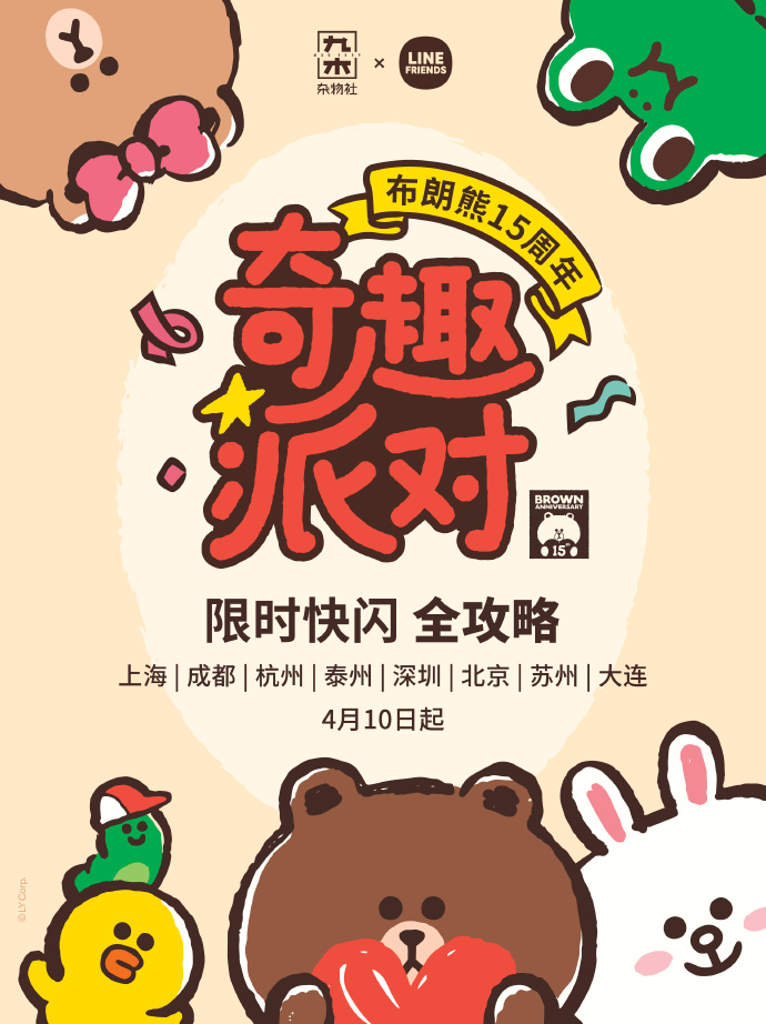 LINE FRIENDS×九木杂物社携手打造的九木「布朗熊15周年奇趣派对」从4月10日起,开展8城限时快闪巡回。本次活动不但推出大量以布朗熊15周年为主题的产品,从毛绒挂件到生活日杂,种类丰富,还将陆续在上海、成都、杭州、泰州、深圳、北京、苏州、大连8个城市开设快闪店或主题店铺,并将邀请知名Coser举办一日店长活动,设置超级萌友见面会、欢乐巡游、打卡、集章、满购赠、抽奖等各种互动活动。