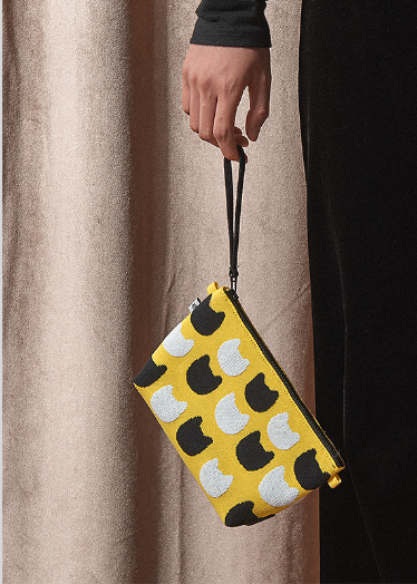 织遇研发的新型织物面料,运用最新的原料科技与针织技术相结合,使面料厚实紧致亲肤温暖。与么么黑的合作,通过不同原料与针织技术运用,使得么么黑纹样突出织物,呈现立体而生动的效果,给织物带来极好的设计感与品质感。