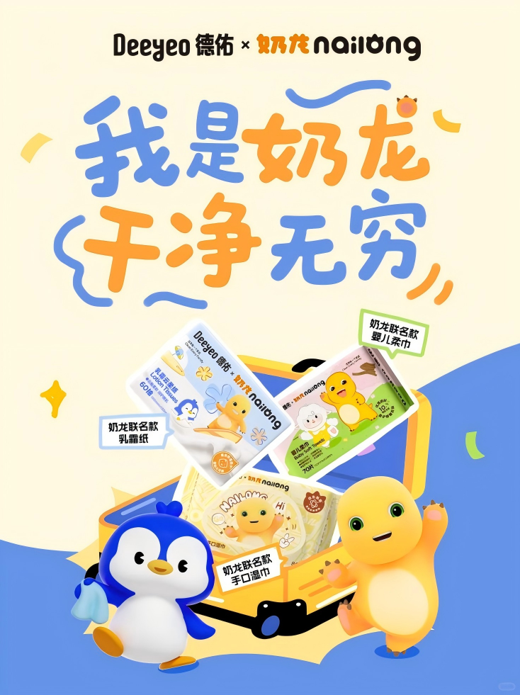 今年,德祐与奶龙达成深度合作,联合推出奶龙联名款“乳霜纸”、“婴儿柔巾”和“手口湿巾”,采用奶龙主题包装,限时赠送限定周边,一经推出便凭借 “高颜值 + 实用属性” 收获市场青睐。本次合作德祐通过奶龙IP在年轻群体中的号召力与影响力,进一步提升并巩固了其在年轻家庭中的品牌影响力。