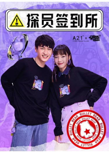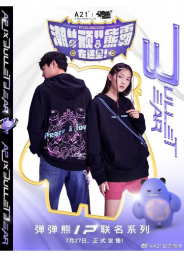 A21与熊霸弹弹熊梦幻联动,顽力全开,此次合作给品牌打造了童趣、神秘属性,新晋潮玩熊霸弹弹熊,在探索无线可能和时尚潮流文化渗透中,把A21品牌新潮感融进各个圈层。