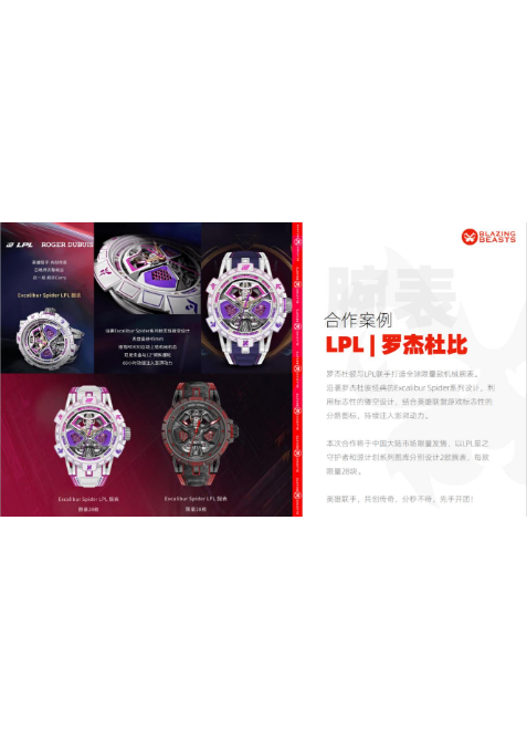 在LPL名人堂的荣誉加冕仪式中,Roger Dubuis罗杰杜彼以全新王者竞速系列LPL限量款红黑腕表致敬三位名人堂加冕成员,以嘉奖不断突破自我,勇敢追梦的电竞工作者。其创作灵感源于英雄联盟游戏和电竞赛事,表圈上的图案取自游戏中五个位置及LPL的标志,红黑款DLC涂层钛合金材质与白紫款陶瓷复合纤维材质配色皆来源于游戏中著名的系列皮肤,使佩戴者在腕间便能感受LPL电竞的魅力。作为“持续创新者”的Roger Dubuis罗杰杜彼自1995年成立以来便一直以其前卫创新著称,品牌植根传统制表工艺,以非凡精神实现技艺与勇气的超越,突破传统与现代的理念藩篱、挑战和创新,这一精神与LPL名人堂不谋而合