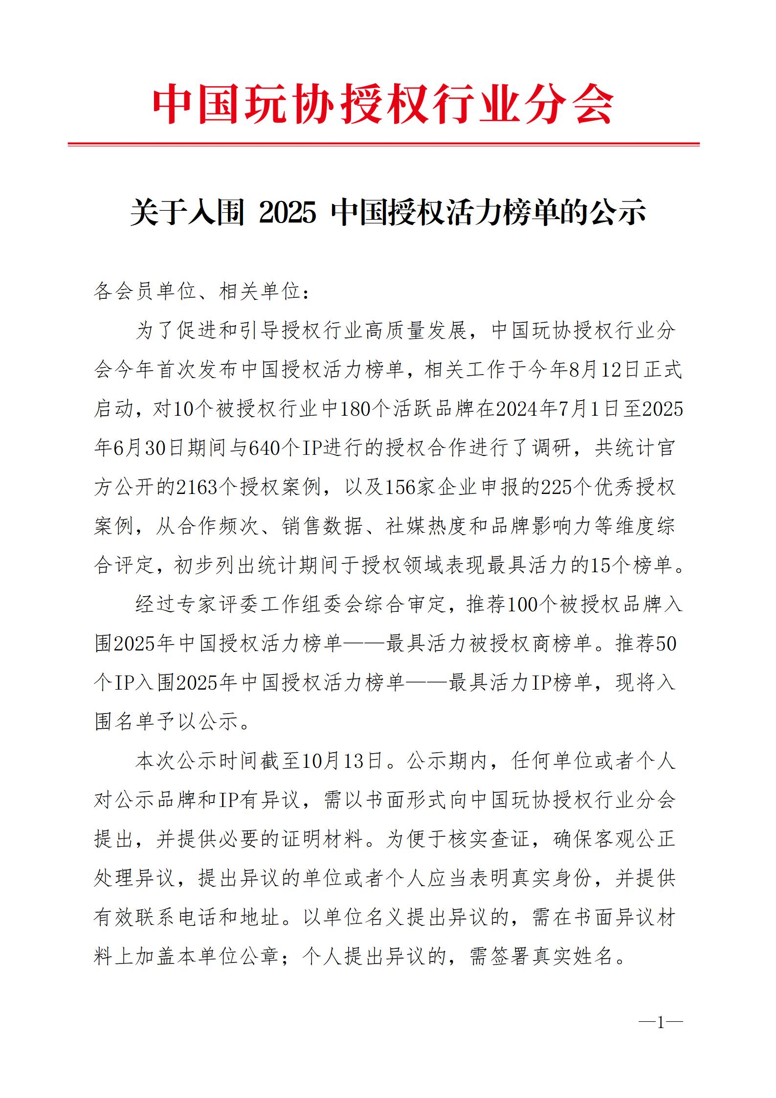 以下为10个最具活力被授权商榜单,入榜品牌以被授权品牌的首字母排序,最终排行将在10月16日CLE授权之夜暨2025中国授权活力榜单发布盛典上公布。