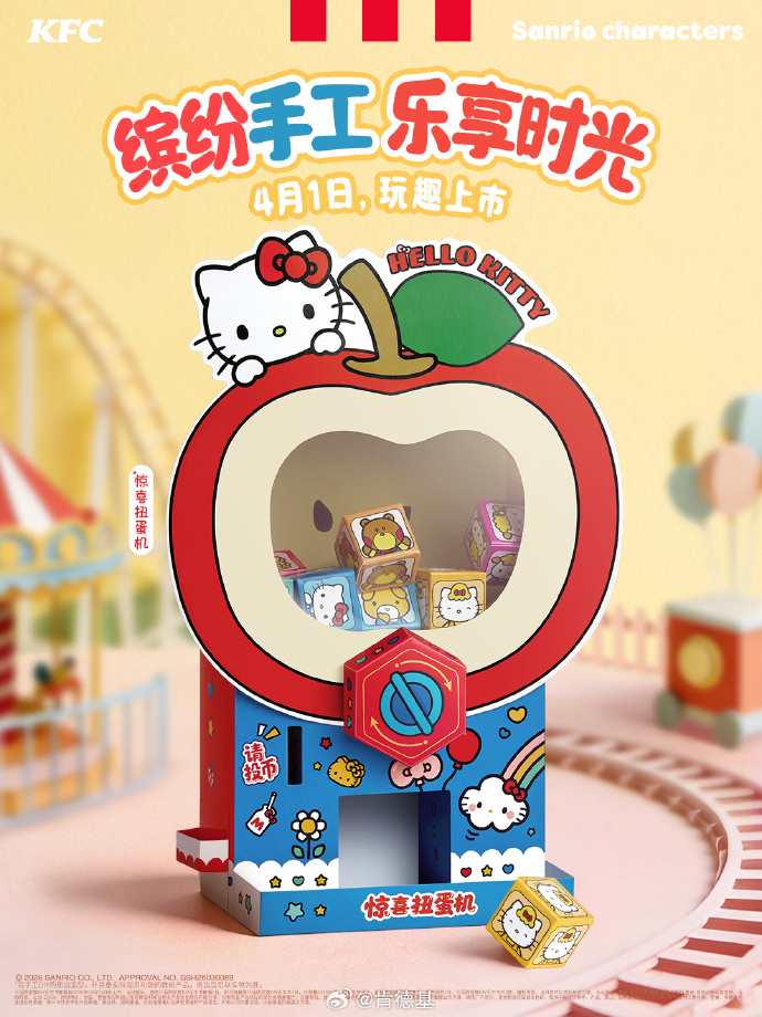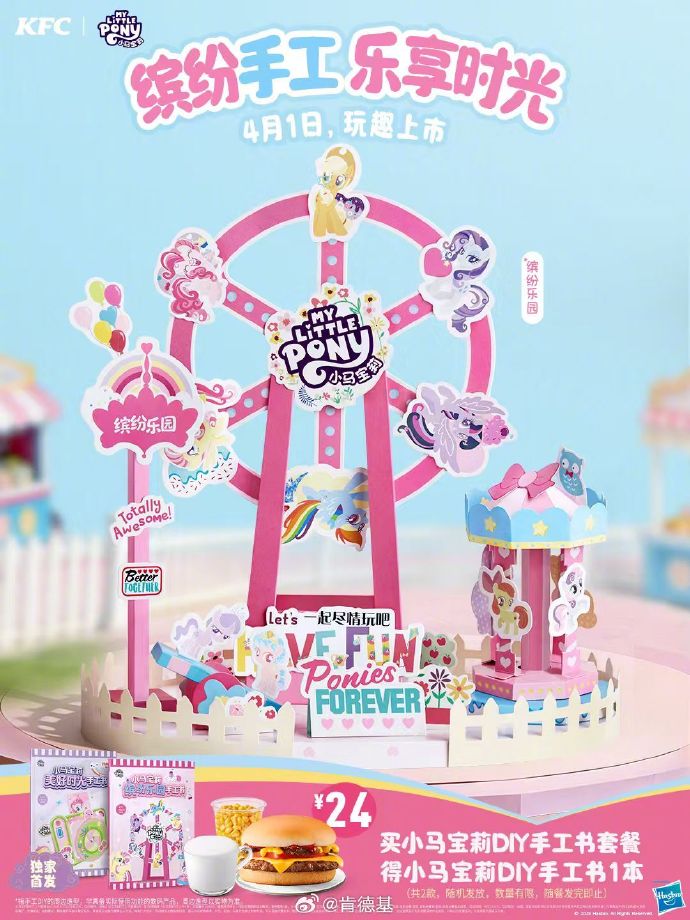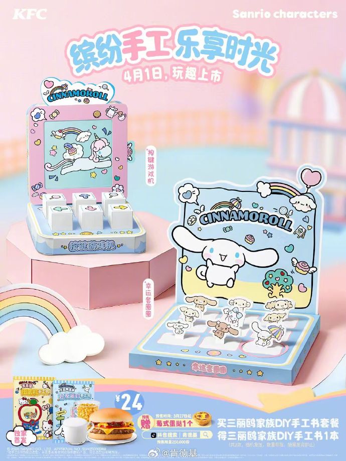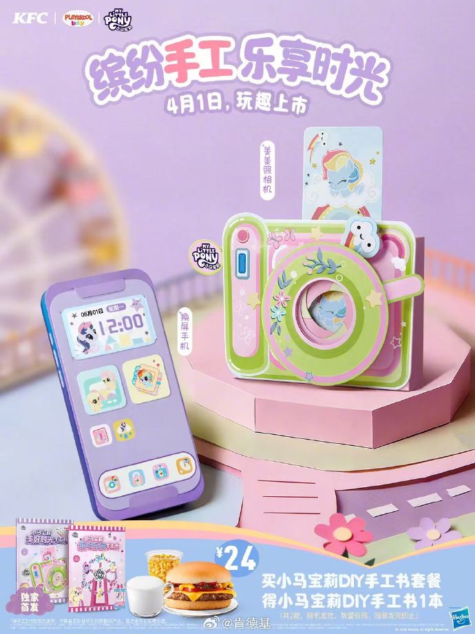 4月1日,肯德基携手三丽鸥家族和小马宝莉推出独家定制的DIY手工书系列,号召粉丝自己动手戳一戳,折一折,粘一粘,免裁剪,亲手做“会动的玩具书”,沉浸式手工,享受解压的治愈时光!